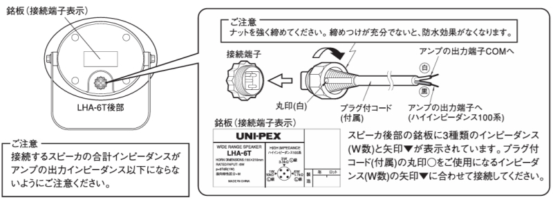 - スピーカー接続コードにコンセント切換式を採用し、定格インピーダンスとハイインピーダンス入力W数を表示することにより、出力の整合が容易です。